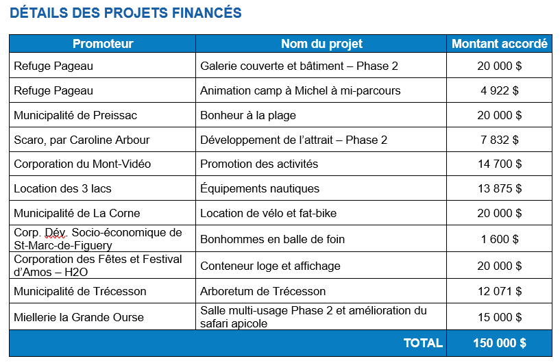 À l'aube de saison estivale, la MRC d'Abitibi annonce son soutien financier à 11 projets en tourisme présents sur son territoire totalisant un investissement de 150 000 $ grâce à son Fonds Touristique. Grâce à son appel de projets, la MRC d'Abitibi appuie annuellement les entreprises privées, corporations et municipalités à développer ou bonifier l'offre touristique de son territoire.