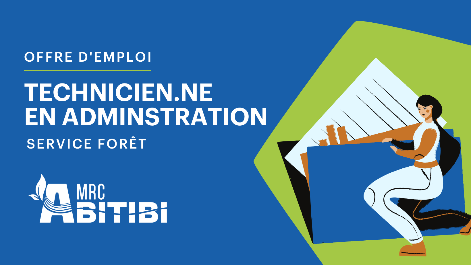 La MRC d'Abitibi est présentement à la recherche d'un.e technicien.ne en administration motivée pour soutenir ses services Forêt, Territoire, Aménagement et la Direction générale. Cette personne passionnée par le travail d'équipe et dotée d'un sens aigu de l'organisation saura jongler avec efficacité les différents défis et tâches variées qui lui seront confiés. Rejoignez notre équipe dynamique pour contribuer au succès de notre organisation!